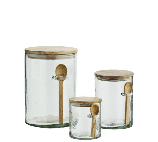 Bocaux en verre avec couvercle et petite cuillère en bois de manguier.