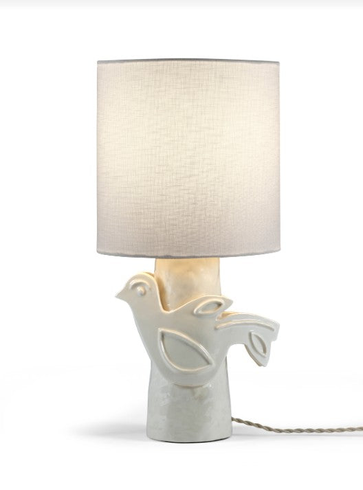 La lampe d'ambiance | PALOMA | au style classique, présente un pied accrocheur avec un abat-jour en lin neutre. Ornée d'une colombe modelée à la main, la lampe évoque les esquisses de Picasso et rend hommage à la fille du peintre, Paloma.