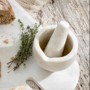 Chaque pièce est unique, avec ses propres veinures et variations de couleur, faisant de ce mortier non seulement un ustensile de cuisine utile, mais aussi un bel objet décoratif à laisser sur le plan de travail.
