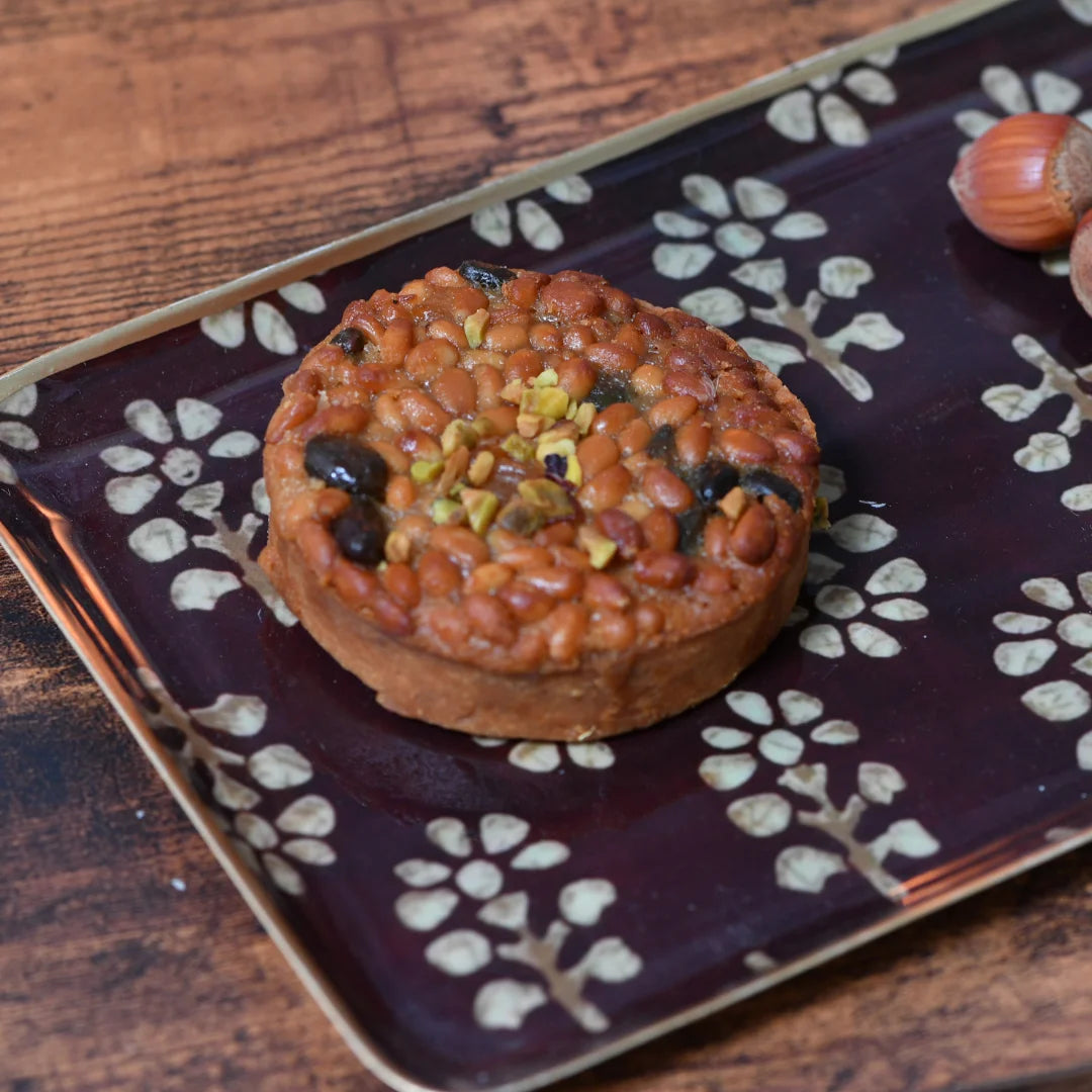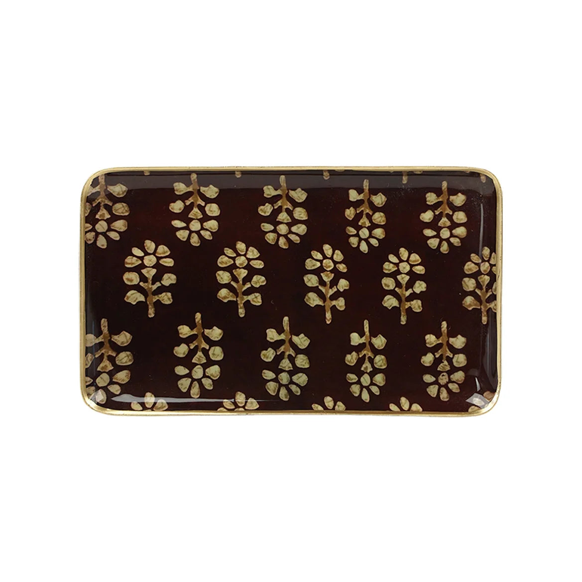 Plateau en métal émaillé avec une bordure dorée, peinte à la main. Ce plateau peut présenter de légères imperfections qui sont la marque de son caractère artisanal.